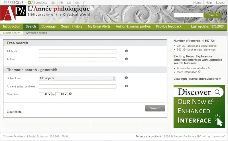 古典学文献年鉴数据库是收录古希腊和罗马文明各方面学术著作的文献数据库。该数据库从1928年出版的第1卷开始,包括各年度索引的所有卷,现已更新至2024年。数据库资源内容涵盖希腊和拉丁文学、语言学(其中包括早期基督教文本和基督教派)、希腊和罗马历史、艺术、考古学、哲学、宗教、神话、音乐等学科领域,以及钱币学、纸莎学和碑文学等分支专业。期刊文章摘要以英语、德语、西班牙语、法语或意大利语提供。图书条目包括目录和书评信息。