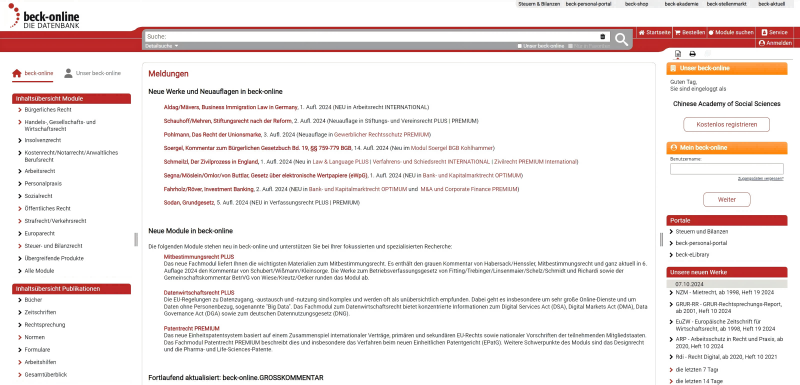 Beck-Online数据库资源涵括民法、商法和贸易法、诉讼法、劳动和社会法、公法、刑法、交通法、税法及审计规则、国际法和欧盟法等法学领域。数据库提供一站式全文检索,每天更新,收录资源最早回溯到1954年。