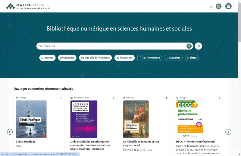 自2011年起,收录 La Découverte、De Boeck、Eres、Presses de Sciences Po、Autrement, Quae、Esprit du temps等出版社出版的会议录、学术文献。后逐步收录电子书约6,000种,共分为两个专集,其中“Collective Works of Research”是最早一批发布的电子书,收录约4,000种学术著作;“Research Ebooks”是新增电子书,收录约1,900种学术著作,两个专集之间没有重复。