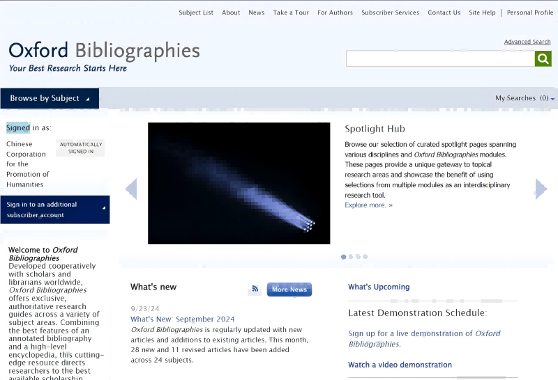 牛津在线参考书目数据库单位提供的研究主题包括:国际关系、哲学、中国研究、国际法、社会学、心理学、人类学、传播学、语言学、非洲研究、美国文学、英国和爱尔兰文学、维多利亚文学、古典学、文艺复兴和宗教改革、大西洋历史等多个主题。