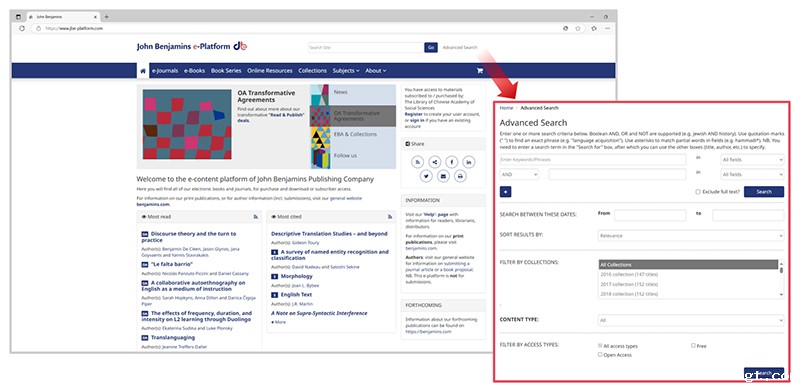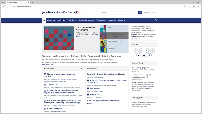 《约翰·本杰明电子期刊》(John Benjamins e-journal)目前收录有可在线访问的107种学术期刊,重点聚焦语言学、传播学、心理学、翻译研究、文学与文化研究、社会学、术语与词典编纂等研究领域,其中,收录有诸多语言学领域的知名期刊。