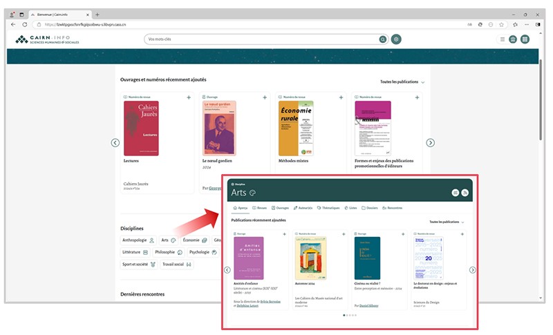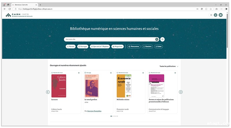 Cairn法语数据库收录了 630 多种来自法国、比利时、瑞士和加拿大的高品质学术期刊,文章超过 20万篇,并且收录的期刊和文章数量不断增加。所有期刊均与纸本刊同步无滞后。学科范围涵盖:历史、信息、语言文学、哲学、心理学、政治学、教育学、社会学、体育、艺术、经济管理、法律、地理等。