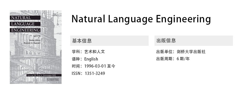 《Natural Language Engineering》创刊于1995年,由剑桥大学出版社出版,专注于自然语言处理技术的应用和开发。