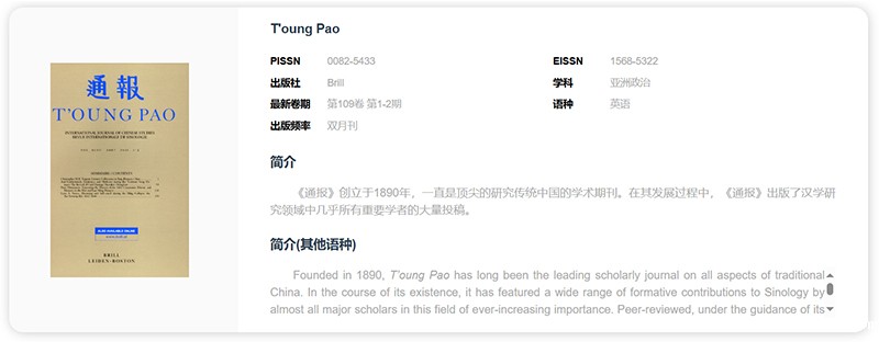 BRILL博睿期刊数据库包含近300种期刊,数据库中所有期刊都经过严格的同行评审,其中有60多种期刊被SCI和SSCI收录,150多种期刊被Scopus 收录,是人文社科领域的学者不可或缺的参考资源。博睿的学术出版物以人文与社会科学学科出版为主,例如古典研究、历史、哲学、艺术、社会科学、区域研究、文学和文化研究、语言和语言学、国际法、国际关系等都是博睿重要的学科出版内容。