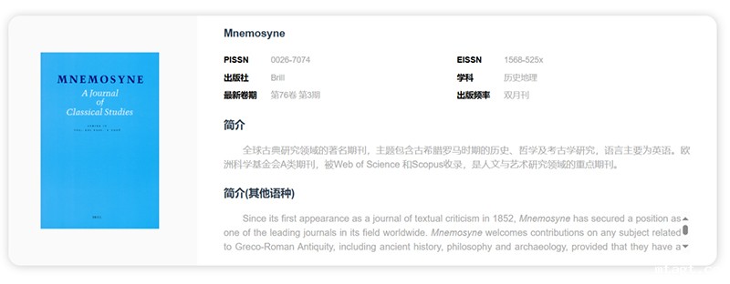 1852年,莱顿古典文化学者科贝特(C.G.Cobet)与博睿合作,创办出版了《古典文献研究杂志》(Mnemosyne),专注于古希腊和古罗马的文献、历史、文化、哲学等领域,该期刊以其高质量的学术文章和书评著称,是古典学研究的重要平台。