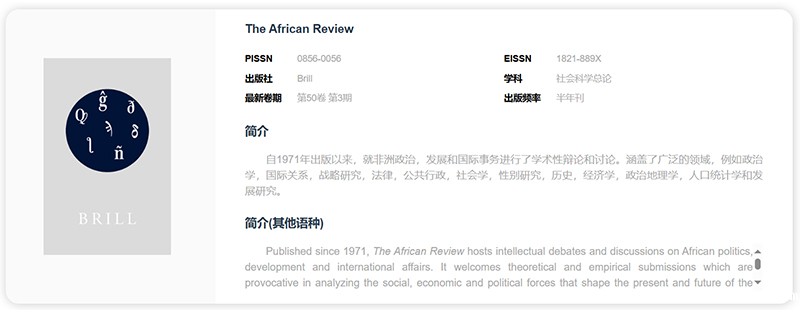 《非洲评论》(The Africa Review)是Brill与印度非洲研究协会合办的一本跨学科期刊,重点关注与非洲事务有关的理论、历史、文学和发展方面的研究。期刊内容涵盖人类学、考古学、历史学、法学、社会学、人口学、发展研究、经济学、教育、性别研究、劳资关系、文学、政治和城市研究。
