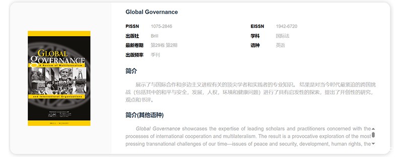 《全球治理》(Global Governance)是一份专注于国际关系、全球治理和多边主义进程的学术期刊,探讨全球性问题的治理机制、政策和国际合作,涵盖环境、安全、经济、人权等领域。该刊创刊于1995年,由莱顿大学和国际研究协会(ISA)共同支持。