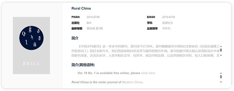 《中国乡村研究》(Rural China)侧重中国乡村理论研究和实证研究,是一份专注于中国农村问题的国际学术期刊,创刊于2003年,由荷兰博睿学术出版社(Brill)出版。该期刊涵盖中国农村的历史、社会、经济、文化等多个领域,期刊所刊载文章具有跨学科和国际化特点,为理解中国乡村的历史、社会、经济和文化提供了学术资源。