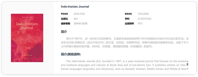 《印度-伊朗期刊》(Indo-Iranian Journal)创刊于1957年,主要研究南亚和前伊斯兰时代伊朗的古代和中世纪语言和文化。发表有关印度-伊朗语言(语言学和文学)的文章,如梵语、阿维斯坦语、伊朗中部和新印度雅利安语。包括关于古代伊朗宗教和印度宗教,如吠陀,印度教,耆那教和佛教(包括藏语)的研究。