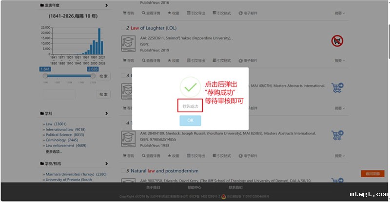 点击荐购会弹出荐购成功的弹窗,待审核通过完成订购的论文即可查看全文。