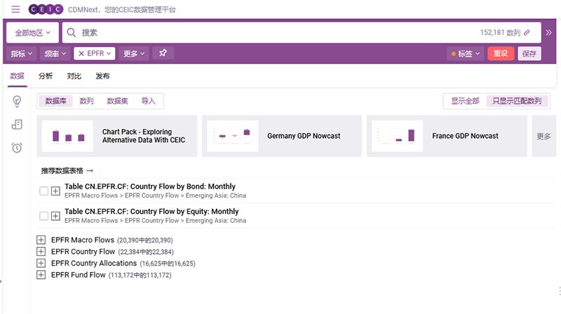 图书馆开通EPFR跨境债券基金数据库,可通过CEIC DATA数据库平台访问使用。上线资源主要包括Country Flow、Country Allocations、Fund Flow、Macro Flows等数据资源。这些资源提供了国家资金流向、国家资金分配及资金流、宏观资金流等数据,跟踪86个国家的20000多个每周和每月系列数据,覆盖超过60万亿美元的资产,能够动态追踪国际资金流动,可帮助用户全面了解推动全球市场的机构和散户投资者流量,展示全球投资基金对各国股票与债券市场的配置比例及动态变化,助力开展多层次基金行为与产品结构研究。