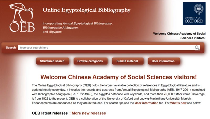 在线埃及学文献目录(Online Egyptological Bibliography,OEB)由牛津大学和路德维希-马克西米利安大学合作出版,是埃及学领域最大的可用参考文献集合。数据库收录资源包括但不限于:《年度埃及学文献目录》(AEB,1947-2001年)的记录和摘要;《古代埃及文献目录》(BA,1822—1946年)的记录;带有关键词的Aigyptos数据库的条目;超过70,000条包括书籍、期刊文章、论文、报告、会议记录等其他相关条目。收录年份为1822年至今。该数据库目前收录了约45,000名作者,超过182,400条记录。外文资源涵盖英语、德语、法语、阿拉伯语等语种。